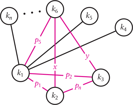 The two routes x$ and $y$ connect city 6 with cities 2 and 3: in total there are $2(n-3)$ routes connecting cities 4 to $n$ to cities 2 and 3. Together, routes $x,y, p_1, p_2, p_5$ and $p_n$ form a tale of four cities.